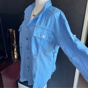 Elevate your style with this chic distressed blue jacket. Perfect for casual outings, it offers both comfort and fashion.