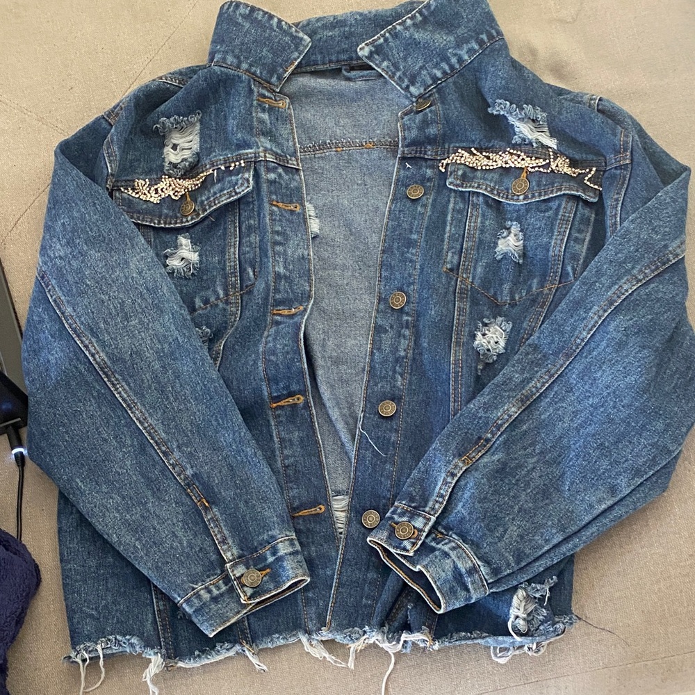 Elevate your style with this chic distressed blue jean jacket. Perfect for casual outings, this jacket adds a trendy touch to any outfit. I was given this as a gift, but I’ve never worn it and it isn’t my style like at all 😂 she bought it for $50 but I’m pricing it at $35