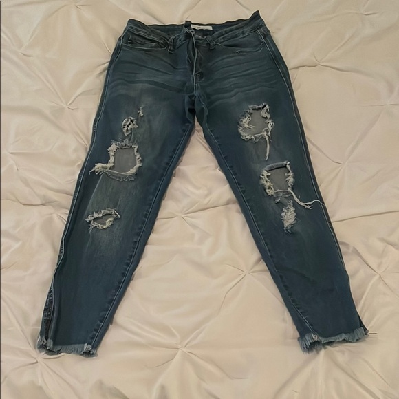 Stylish distressed jeans in a classic blue shade. Perfect for a casual, trendy look.