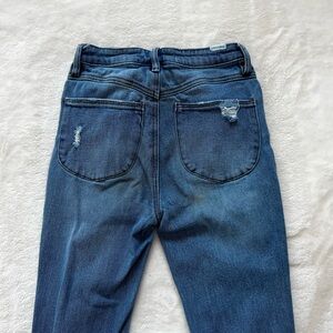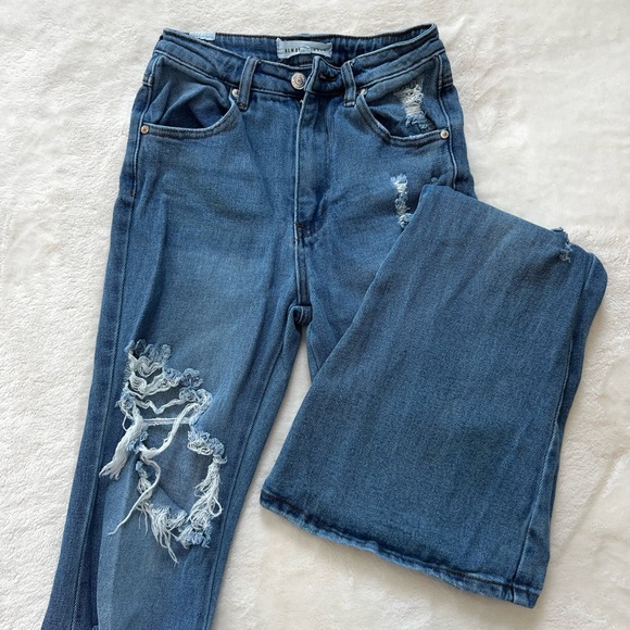 Stylish distressed blue jeans perfect for a casual look. Comfortable and trendy, ideal for everyday wear. Tighter thighs, loose bell bottoms.