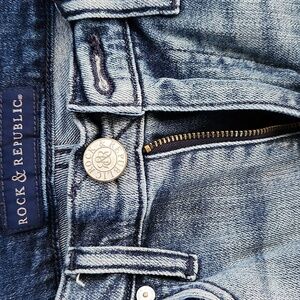Stylish blue jeans featuring distressed details and bird embroidery. Perfect for a casual look. Rock & Republic, size 8M. these jeans are like new, hardly worn. 29" inseam, 14" across on waist.