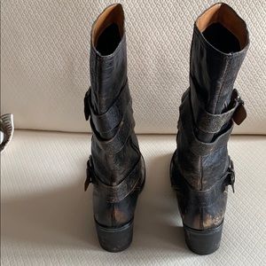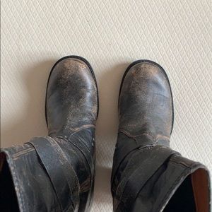 These are super sweet boots. They have a brown/ black distressed look to them. Kind of a motorcycle style boot. Buckles on side. Just cleaning out closet. Worn probably 5 times.