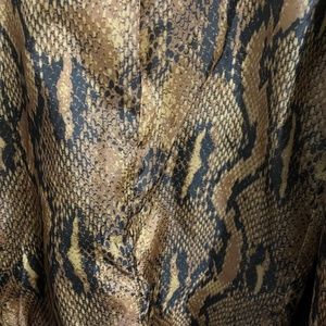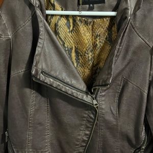 Brown distressed leather vintage jacket with animal print inner lining. Very cool placement of zippers adding to the look of the jacket. Very fun to wear & versatile, can be worn to dress up an outfit or with jeans to dress down! Runs true to size and lays at the hips.