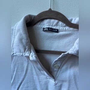 Beige polo from Zara. Soft, sweatshirt like material in a boxy, cropped style. Slightly distressed around the collar.