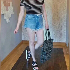 Ultra High Denim Cutoff Shorts by Simple Society. These light wash, faded and frayed jean shorts are distressed and super sky high. Due to fraying, they're not perfectly symmetrical. Size 13/31.