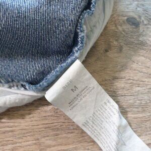 Distressed fabric with intentional fraying. No notable damage beyond design.