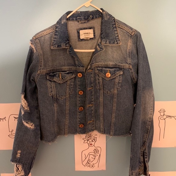 This is a Forever 21 distressed denim jacket. It is very stylish and cute! The color is exactly what it appears to be on the screen. It is not oversized, or an exact fit. You have just enough room to move comfortably.