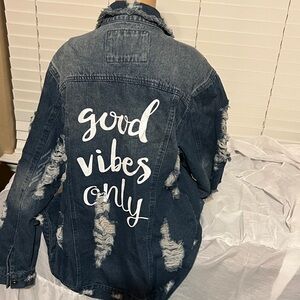 Stylish distressed denim jacket perfect for casual outings w 2 pockets . Features a classic blue color with a trendy worn look.
