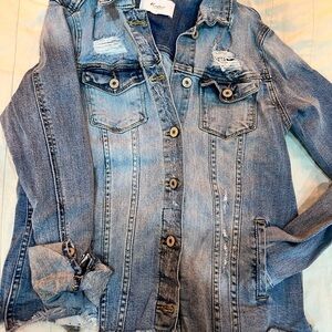 Classic distressed denim jacket with a stylish look. Pockets, raw edge. Features a comfortable fit. Ideal for everyday wear. Never worn.