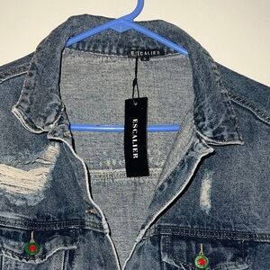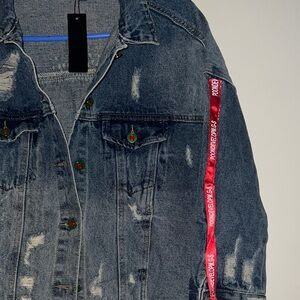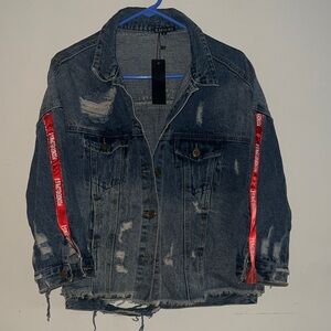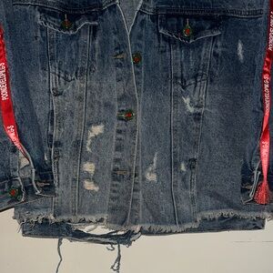 Trendy distressed denim jacket with striking red ribbon accents on the sleeves. Ideal for a casual and edgy look.