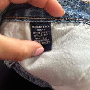 Trendy distressed denim mini skirt with frayed hem. Perfect for casual outings.