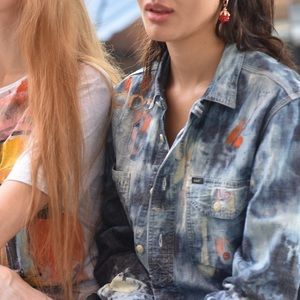 Distressed Lee denim shirt jacket with special hand painting by artist Bai.