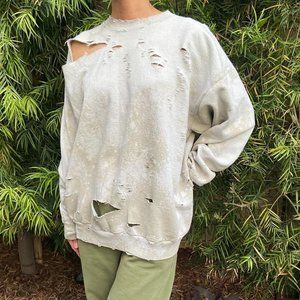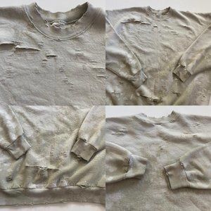 soft hand feel knit fleece fabric with nicely worn down washed look. holes, rips, pulls and fading throughout the body from wear and age...........looks cool!. stains with high and low color bleeding all over the body! relaxed oversized Big fit!🤍