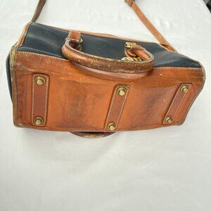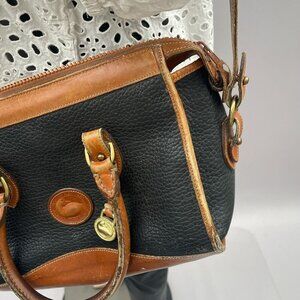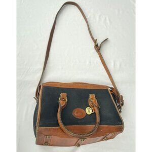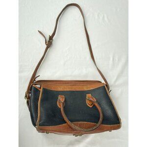 Tags: Vintage handbag, leather bag, Dooney & Bourke, satchel purse, shoulder bag, black brown bag, classic handbag, fashion accessory, vintage style, leather purse, women's bag, timeless design, leather satchel