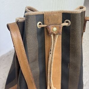 Please look at the pictures. This is a project bag. Inside the lining has split. The leather trim and drawstring has peeled so that now it is cloth. As you see all the tan needs to be resting. At some point, the leather strap has been fixed needs to be redone. This is a project bag being sold as is. Measuring across the bottom is 11 five 13 x 6. Measurements are approximate.