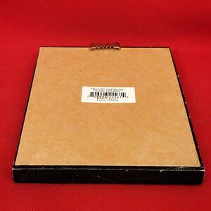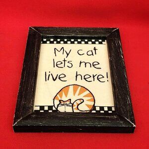 A framed decorative sign with a black frame and a cream-colored background. The sign features the hand-lettered phrase, "My cat lets me live here!" below which is an illustration of an orange and white striped cat curled up and sleeping. The top and bottom edges of the background have a black and white checkered border pattern.