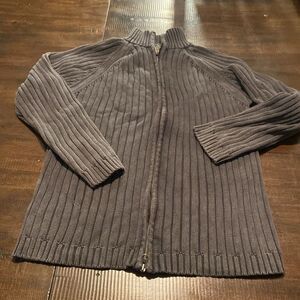 Stylish gray ribbed sweater with a zip-up front. Perfect for layering.