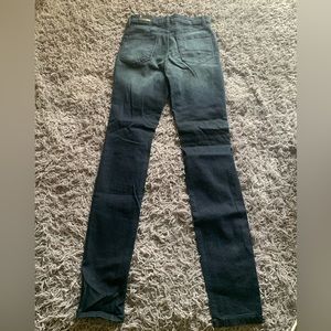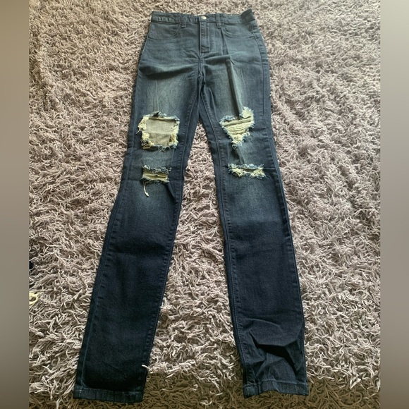 Distressed Jean Blue wash Fitted not tight Distress only on thighs No front pockets Belt loops Back pockets Never worn