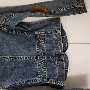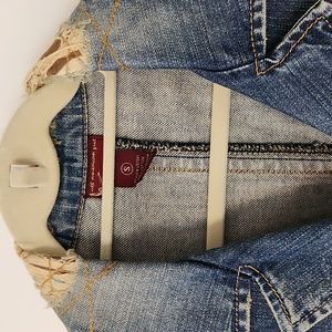 Ironside bought at Nordstrom, brand All American War Jeans distressed jean jacket. Fun detail all around the coat with pockets and rips and elbow patches.