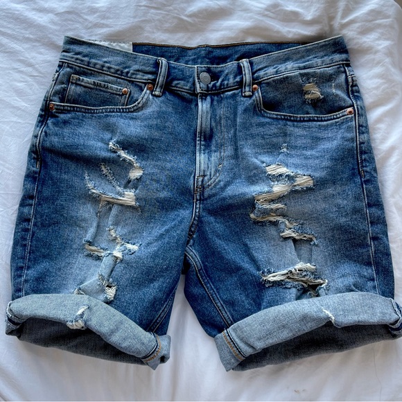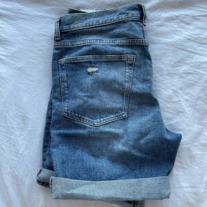 Men’s jean shorts, could be worn as “boyfriend style,” distressed on front, 5 pocket.