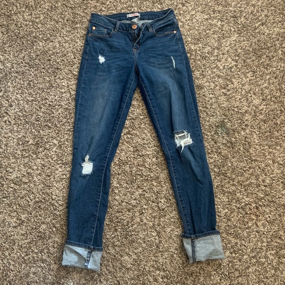 Distressed dark wash jeans. True to size with some stretch. Mid-rise skinny jeans