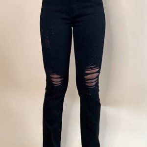 Distressed straight leg black jeans with side split. Button and Zipper closure. Good Stretch Denim.