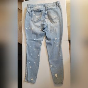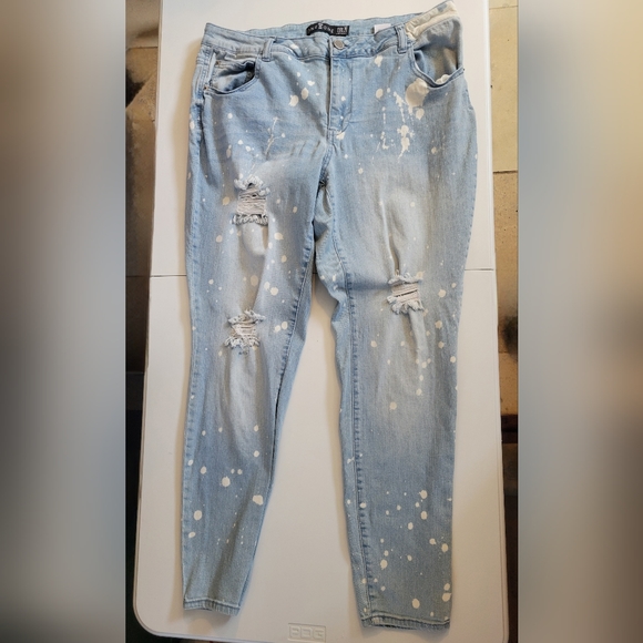 Distressed Jeans, thinner denim material, functional pockets, distressing on the front and bleach splatters on front and back, size 18 but runs slightly loose in my opinion.