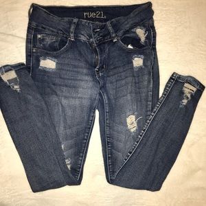 -Rue 21 mid rise jegging size 6, medium wash with lots of distressing. There is also some distressing on the back of the heel.