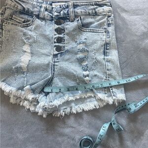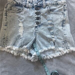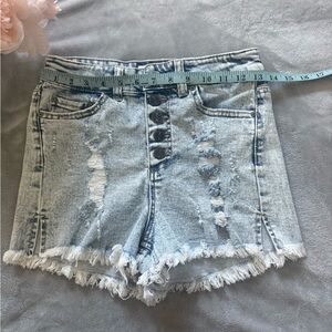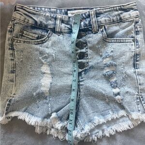 Step out in style with these distressed light blue denim shorts. Featuring a frayed hem, they offer a trendy and casual look.