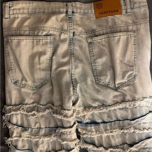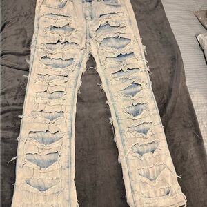 Stylish distressed jeans with a light blue wash. Features extensive ripped detailing for a trendy look. Never worn, washed to try to remove stain by back pocket. Shown in picture