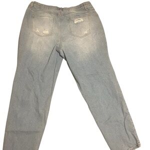 Stylish distressed jeans in a light blue shade. Perfect for a casual, trendy look. High waisted jeans, mom jeans style and fit with stretchy waist band. Distressed Light Blue Women's Jeans “ Wax Jean Collection” Size 1X
