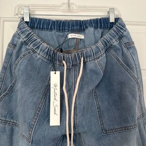Distressed Light Wash Elastic Waist Denim Jogger Jeans W/ Drawstring