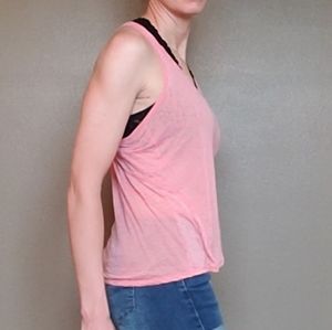Cute lightweight racerback shirt, i often layer with another raceback shirt. There are two small dark marks on the inside back strap, didn't even notice until I was taking pictures and then a small hole on the front lower right side. Please see pictures for details.