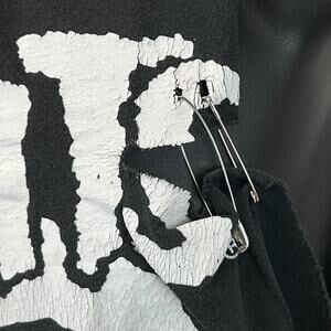 Has fading, image cracking, safety pins holding a rip together, and the sleeves have been cut off. You won't look like a new fan of the band wearing this. No other flaws noticed. See photos.