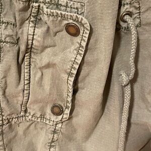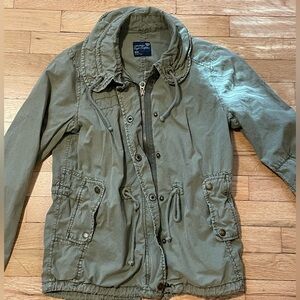 Casual khaki utility jacket with classic design. Distressed, broken in look. No holes, tears, or stains. Features durable fabric and practical pockets.