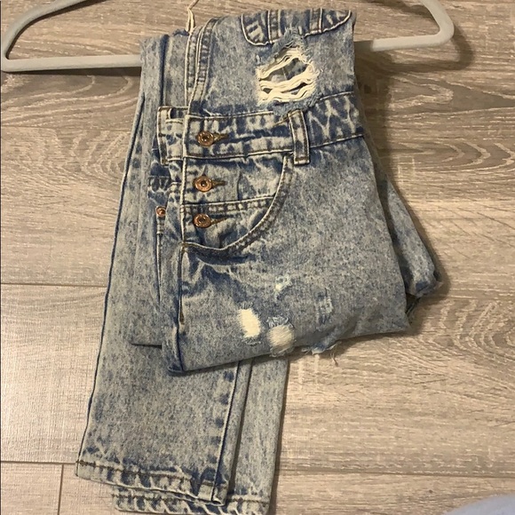 Distressed denim overalls, rips along the legs, detachable straps
