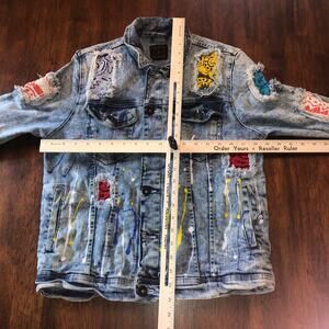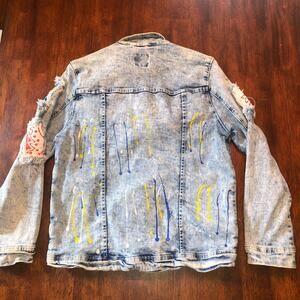 Distressed Patched Painted Acid Wash Stretch Denim Jacket Mens Small Blue Seven