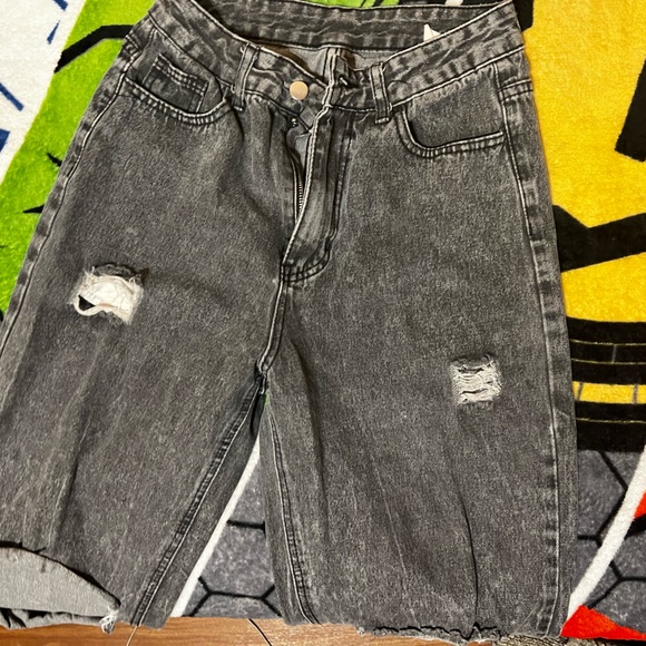 Black, distressed, ripped jeans. Reach to about your ankle (for 5’1-2).