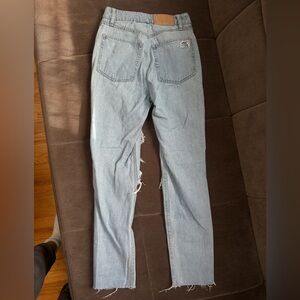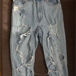 Trendy distressed light blue jeans. Mom jean style.