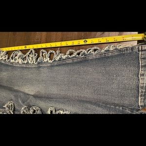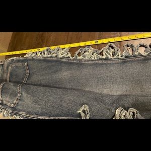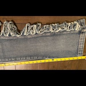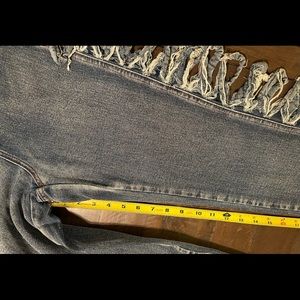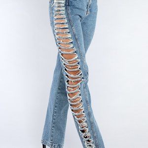 - Features: High rise, Zip up closure, Ripped frayed sides, Relaxed fit silhouette.