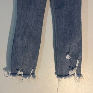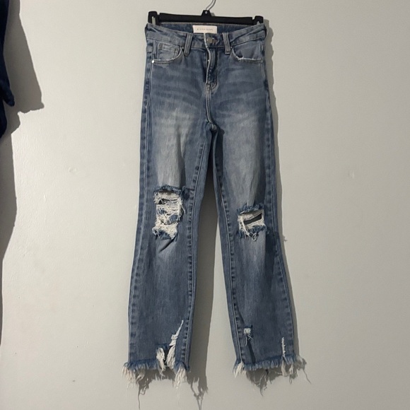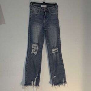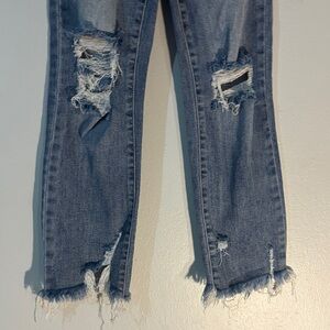 Stylish distressed Risen blue jeans perfect for a casual look. Comfortable, stretchy and trendy, these jeans are a must-have for your wardrobe. Size 0/24 inseam 26 in