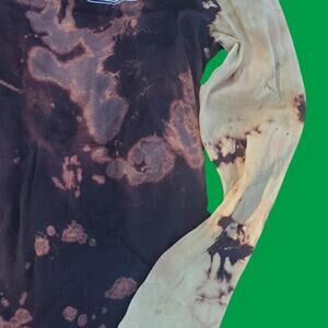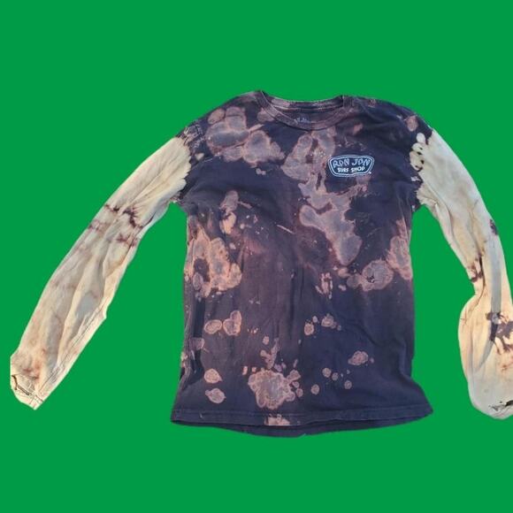 Extremely distressed bleach dyed Ron Jon shirt. The sleeves do have a lot of holes and fraying. The size is a men's medium.