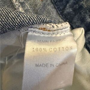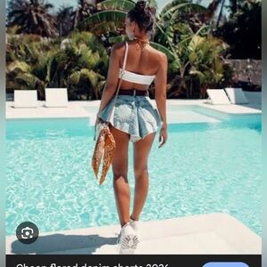 Stylish distressed denim shorts. Features a frayed hem and classic blue wash.