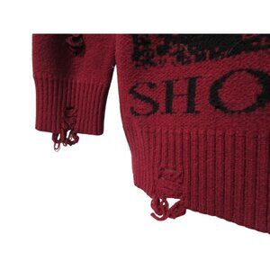 This sweater isn’t just for keeping you warm; it’s got personality. With intentional distressing, you’ll look like you’ve been through a stylish apocalypse. Holes are intentional, it looks thrashed in a well made way. Dark red and black. Salvation priest on front, Show Xin Dou across front hem. Show Xin Dou Star Fod Supu Efo Rmb on back. Over sized M/L based on measurements