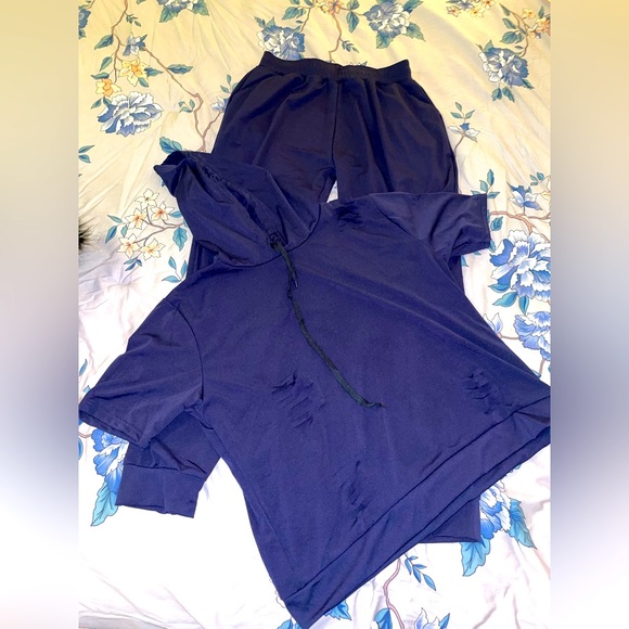 Super soft navy distressed set. Slight slights around outfit as pictured. New never worn.