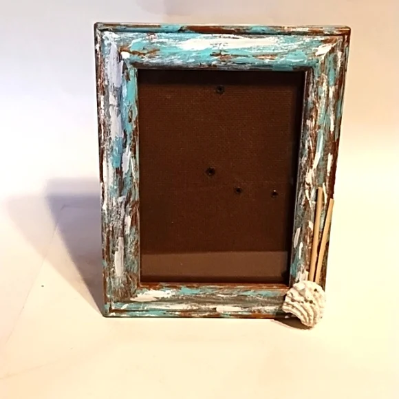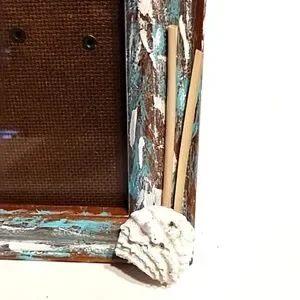 This is used but still in good condition. It is a repurposed hand painted wooden frame with added ocean shell and beach straw.