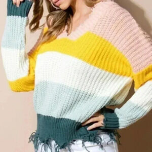 Check out Josie Sweater! The striped color combo is fabulous and I am loving the distressed hem details.