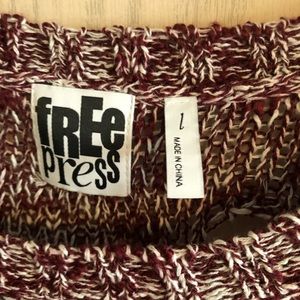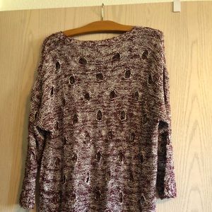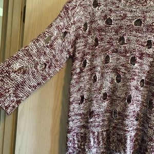 Such a cute distressed sweater, worn once. This piece looks handmade, with a cute holed pattern. The hem, which is later ne’er in the back, and cuffs have a vertical pattern whereas the rest of the sweater has a horizontal pattern of maroon (wine) & white. Size L