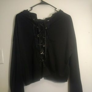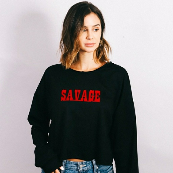 This sweater has a distressed look made with a light material with the word "SAVAGE" across the front made with a felt cutout font. It has a distressed, ribbon crisscross at the back. This will pair well with jeans and sneakers. Please note that the material is not heavy like a hoodie.