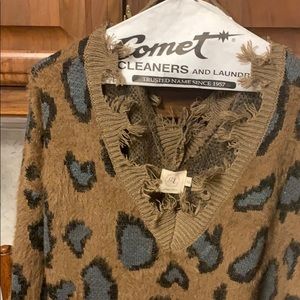 Leopard print fuzzy sweater! Dark tan with gray spots, very soft, frayed at the bottom and around the neckline. V neck in the front and back. Runs a little big.